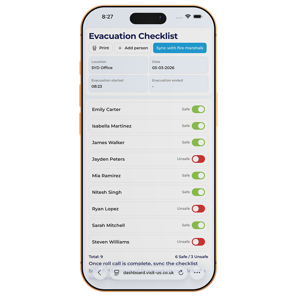 The Evacuations module gives wardens and safety teams a live view of who is on site during drills or real emergencies, helping you account for people quickly and meet compliance requirements.